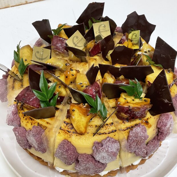 サクサクタルトに芋のブリュレと自家製安納芋クリームで4種のクリームを贅沢に使い、大学芋を上に飾りました。